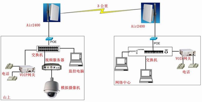 因為設(shè)計要傳輸該企業(yè)的語音、數(shù)據(jù)及視頻,整體數(shù)據(jù)流量大,所以,根據(jù)實際情況我們選配帶寬達54M并且集成15dBi定向天線的室外網(wǎng)橋Air2400-15。該網(wǎng)橋可工作在-30度至60度,可以適應(yīng)室外的高、低溫天氣。