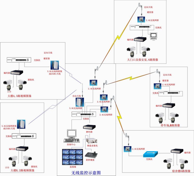 肇慶某工廠(chǎng),面積大概40萬(wàn)平方米。需要對(duì)整個(gè)工廠(chǎng)實(shí)現(xiàn)無(wú)線(xiàn)監(jiān)控,根據(jù)客戶(hù)需求及本公司的實(shí)際經(jīng)驗(yàn),設(shè)計(jì)在公司的辦公大樓A和B、宿舍樓、大門(mén)口均安裝攝像機(jī),并且通過(guò)無(wú)線(xiàn)的方式傳輸?shù)奖O(jiān)控中心,因?yàn)閭鬏數(shù)膱D像較多,所以在監(jiān)控中心屋頂架設(shè)4套Airwide無(wú)線(xiàn)網(wǎng)橋設(shè)備,為了錯(cuò)開(kāi)頻率及節(jié)省成本,設(shè)計(jì)為:大樓A、B使用5.8G頻率傳輸,其余為2.4G頻率傳輸。其中5.8G傳輸設(shè)備的配置如下:采用點(diǎn)多兩點(diǎn)的形式,中心點(diǎn)采用Air5800-E網(wǎng)橋,外接一副12dBi全向天線(xiàn)AW-5112,在A、B大樓上分別安裝1套5.8G Air5800-23網(wǎng)橋,該網(wǎng)橋集成23dBi高增益天線(xiàn);2.4G傳輸設(shè)備的配置如下:大門(mén)口、停車(chē)場(chǎng)、宿舍樓均采用點(diǎn)對(duì)點(diǎn)的形式與中心點(diǎn)相連,采用無(wú)線(xiàn)設(shè)備為:Air2400-E,該設(shè)備外接天線(xiàn),均配置16dBi定向天線(xiàn),負(fù)責(zé)接收各點(diǎn)視頻數(shù)據(jù)及發(fā)出各種控制信號(hào)以控制前端視頻設(shè)備。