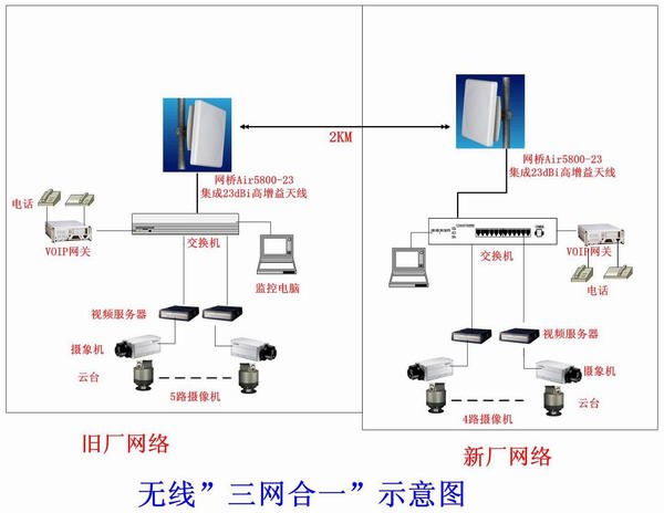 廠區(qū)無線監(jiān)控應用---河北石家莊某工廠,因業(yè)務發(fā)展,在距離2KM之外的地方新建一個工廠,隨著工廠的建成,網(wǎng)絡通信成了一個大問題,應客戶的要求,大宏科技技術(shù)人員到現(xiàn)場給客戶做了一個詳細的設計。在設計當中,值得一提的是,客戶原來只是想解決監(jiān)控及數(shù)據(jù)共享問題,后來我公司的技術(shù)人員根據(jù)多年的設計經(jīng)驗,提出了在傳輸視頻、數(shù)據(jù)的同時傳輸語音,這樣一來,就同時替客戶解決了電話的問題。經(jīng)過測試,圖像穩(wěn)定、流暢;語音清晰,延時小,真正替客戶解決了問題。