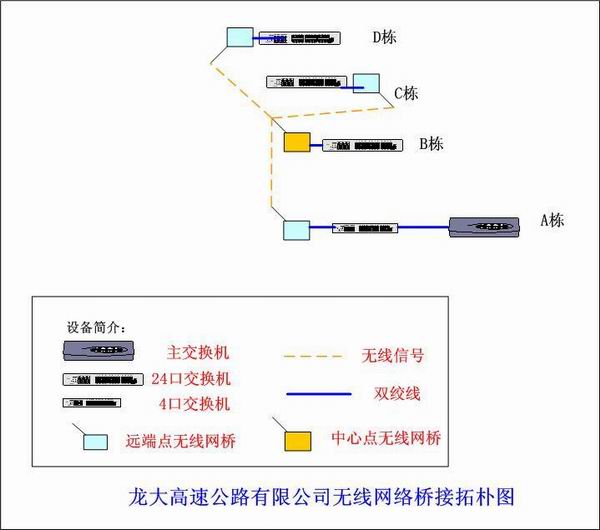 深圳龍大高速公路有限公司管理區(qū),有辦公樓一棟,標(biāo)為A棟,宿舍樓三棟,分別標(biāo)為B、C、D棟B、C、D分別與A棟實(shí)現(xiàn)無線橋接。拓?fù)鋱D如下: